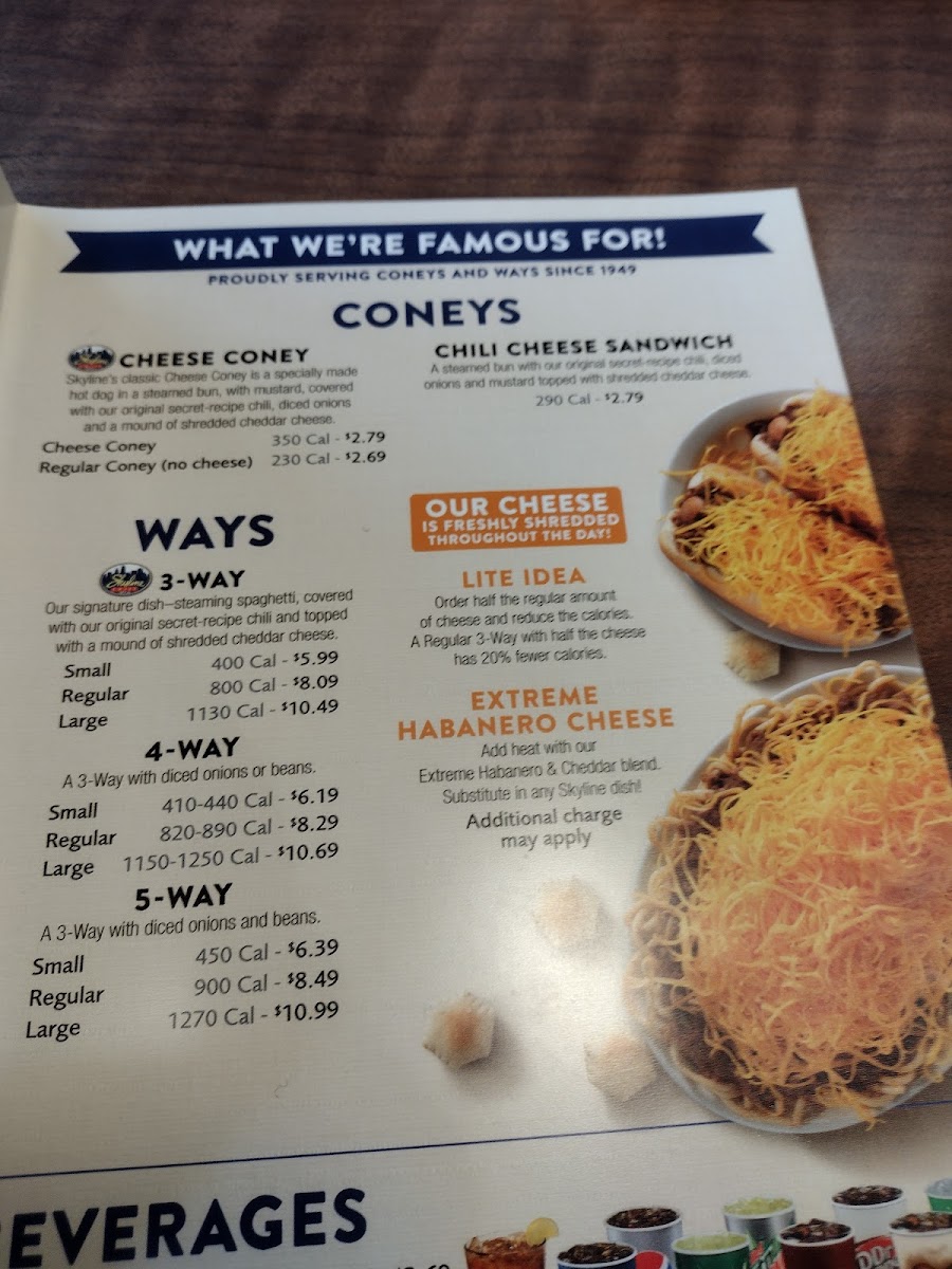 Skyline’s classic Cheese Coney is a specially made hot dog in a steamed bun, with mustard, covered with our original secret-recipe chili, diced onions and a mound of shredded cheddar cheese