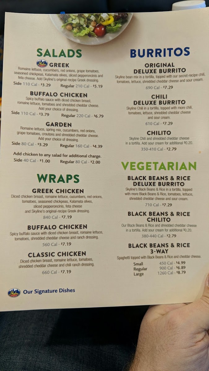 Skyline bean mix in a tortilla, topped with our secret-recipe chili, tomatoes, lettuce, shredded cheddar cheese and sour cream.